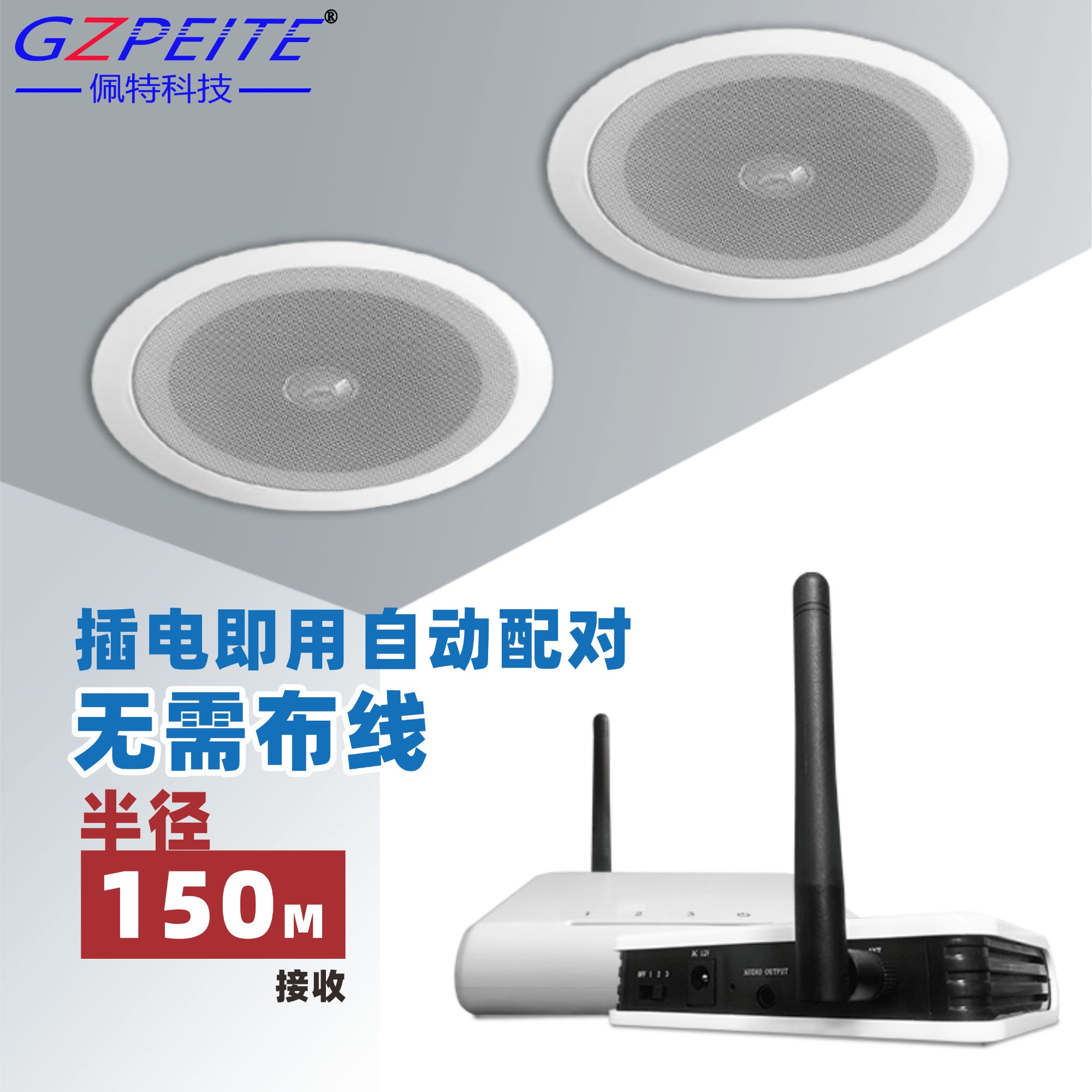佩特科技PET-WXR/T-6x無線吸頂音響功能突出,無需布線、插電即用,傳播范圍可達半徑150M,加裝天線可實現更遠距離信號傳輸。